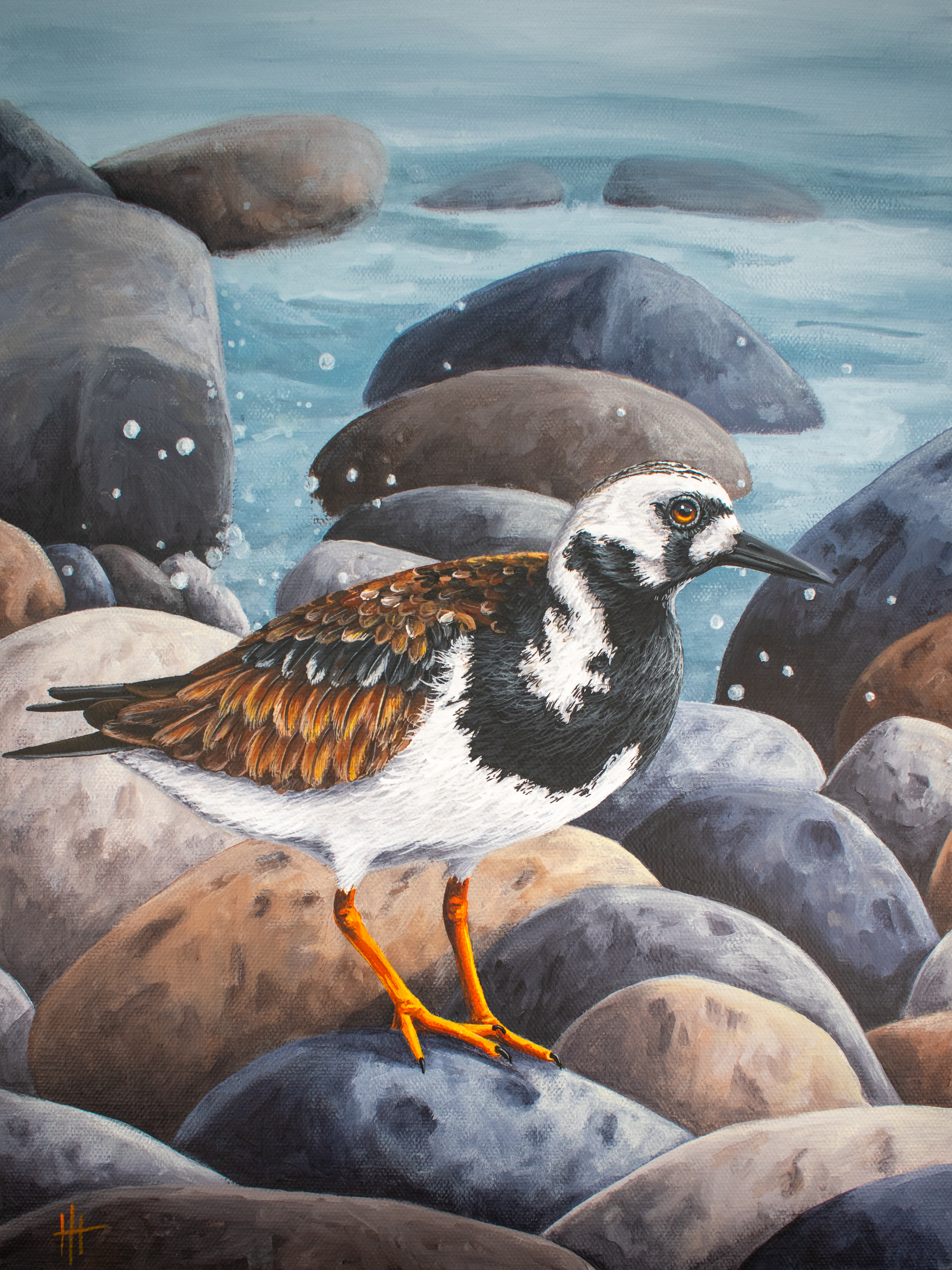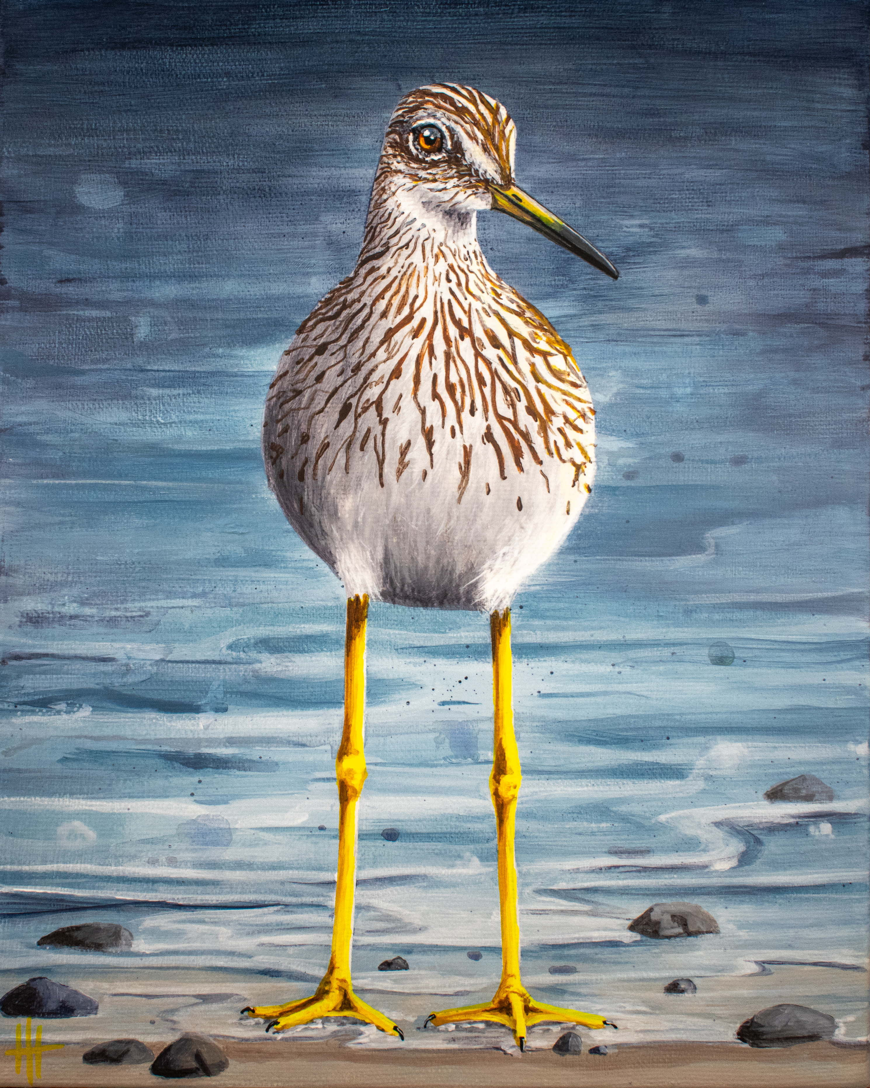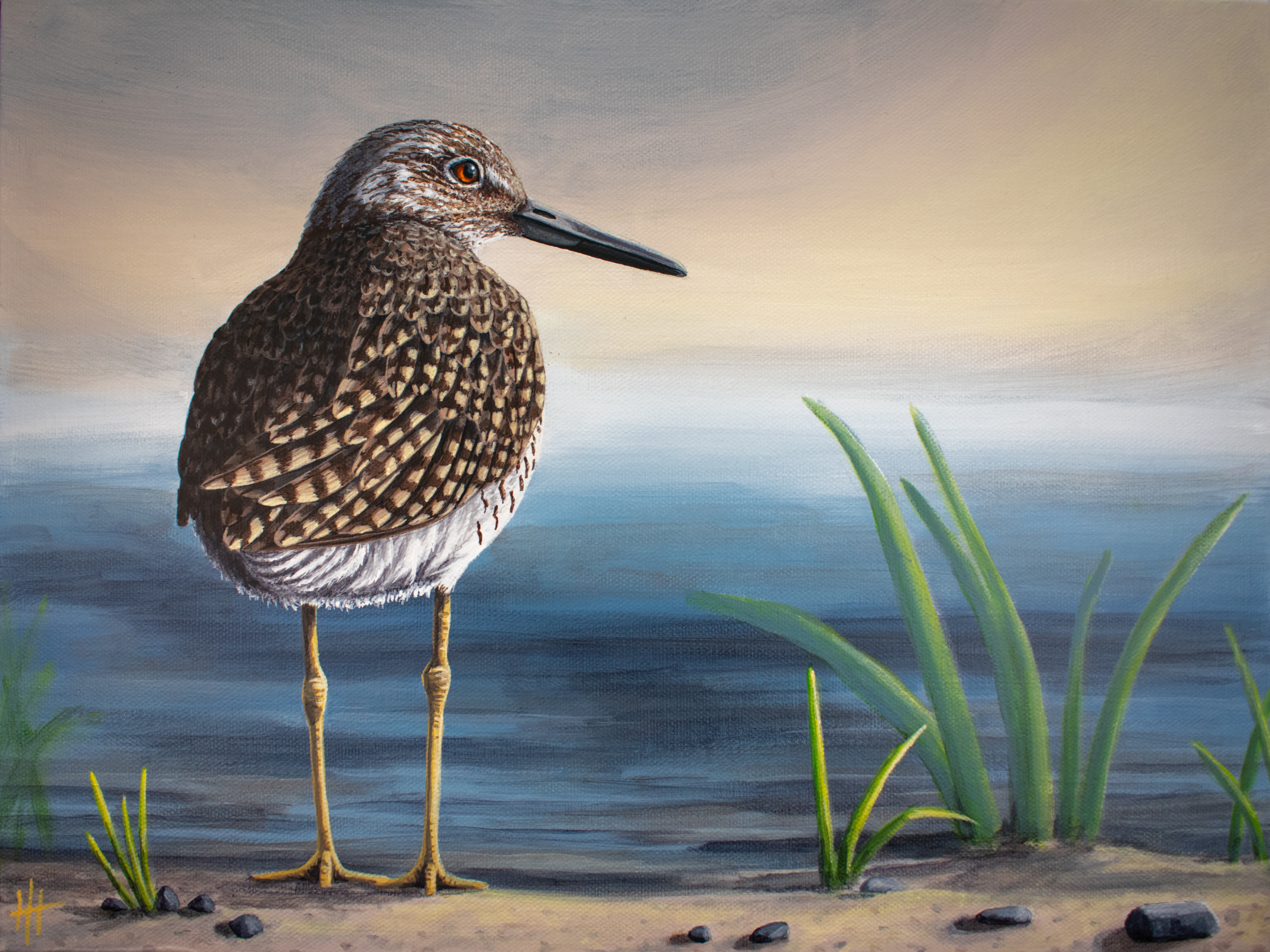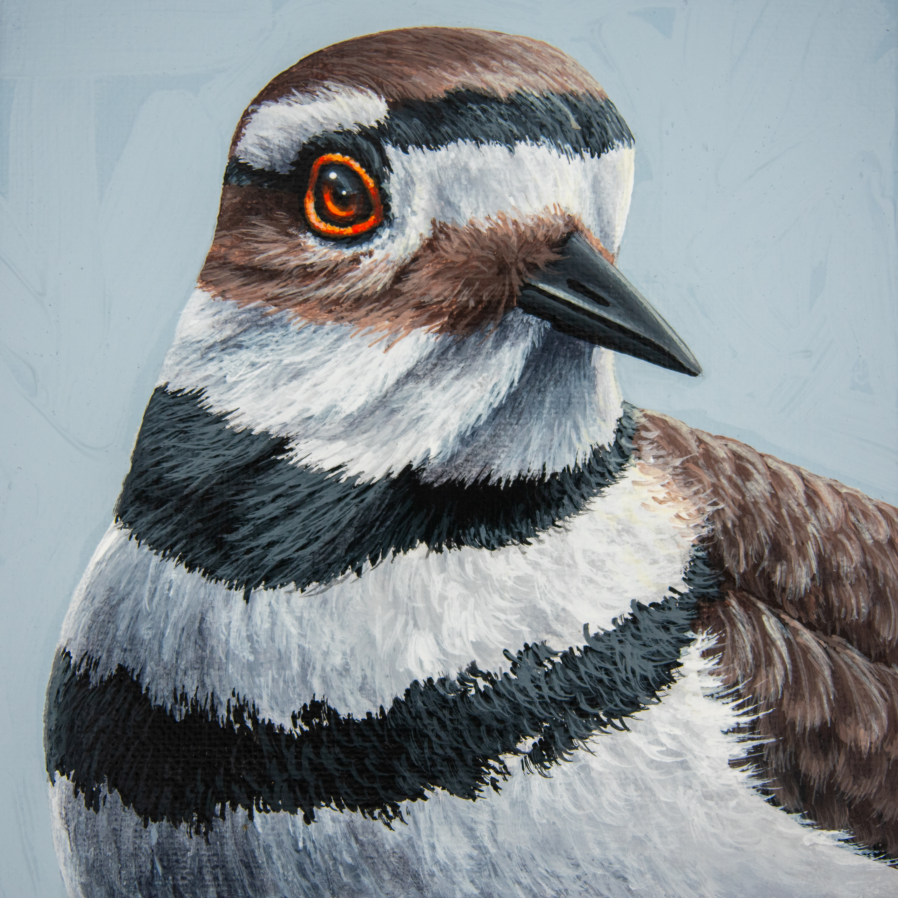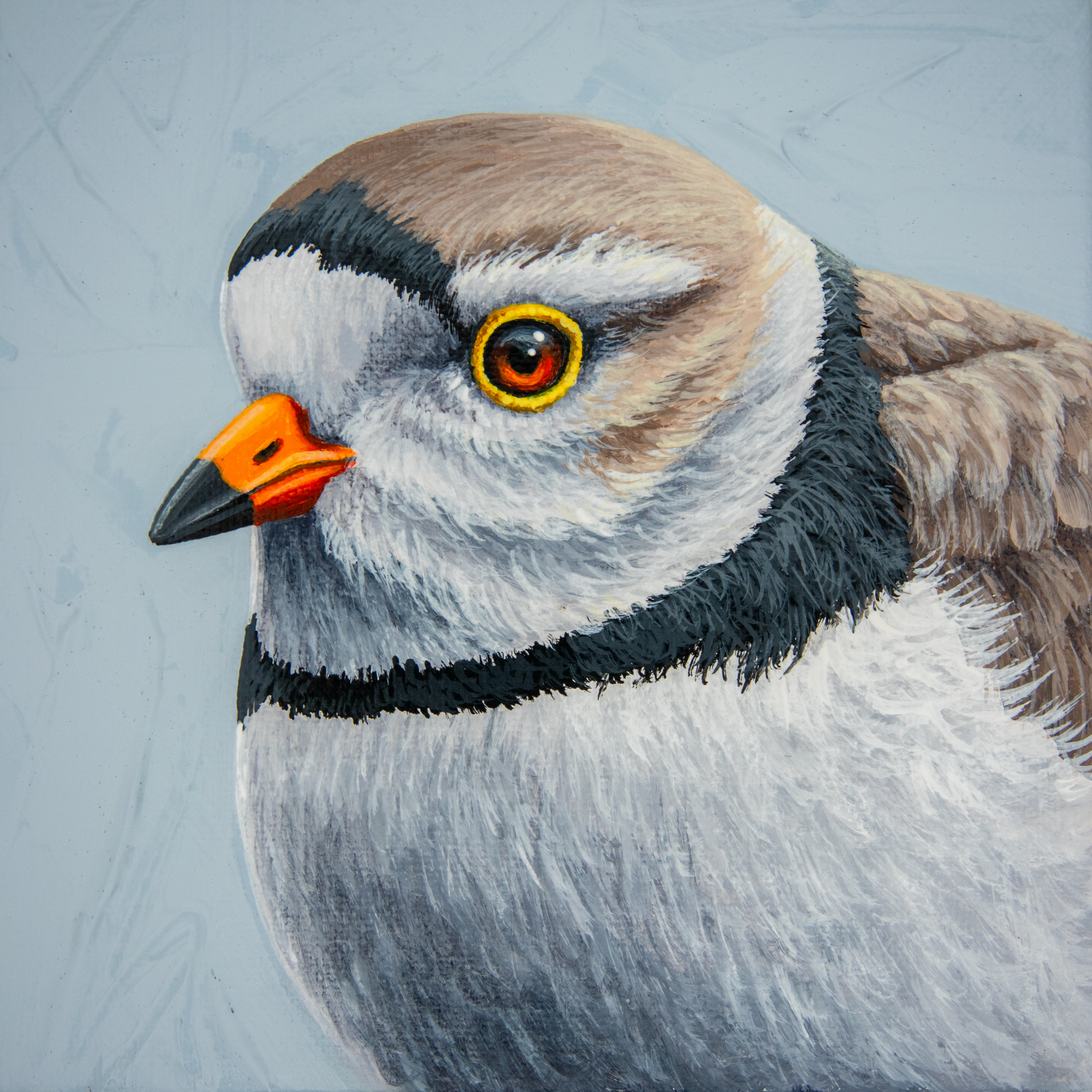 Heidi’s artist style is characterized by layered, rhythmic techniques that evoke the constant movement of the Nova Scotia coastline. She mixes vibrant hues directly on the canvas, allowing natural gradations to emerge organically within each composition. Airy layers of colour—especially in scenes of dawn light over sandflats—feature soft pastels set against richer tones, with transparent glazing effects reminiscent of diluted acrylic washes. Through multiple semi-transparent coats, Heidi builds a palpable sense of atmosphere and depth, capturing effects like haze, drift, and distant horizons, while conveying feather-light textures seen in motifs such as wings and facial features. Her style features close-up imagery of birds, where crisp, miniaturized strokes are layered over more fluid backgrounds, effectively emphasizing detailed structure within broader abstraction. Controlled scaling and a watchful eye for realism are evident throughout her work, as sharp outlines and fine accents are thoughtfully overlaid on expressive washes, achieving a harmonious balance between precision and abstraction. This approach enables Heidi to vividly capture the co-existence of bird, land, and observer, reflecting her immersive experience along Nova Scotia’s diverse coastal regions and her focus on at-risk and endangered species.